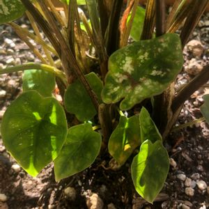 以前…いただいたガーデンカラジウム“ハートトゥハート”の根本から、小さな葉っぱが出てきました。ちゃんと柄も入っていて可愛い〜❤️