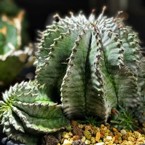 ①ユーフォルビア・ポリゴナ スーパーゼブラ✕スノーフレーク 頭がトゲトゲになってきた。 白くて素敵。✨️ ②ユーフォルビア・バリダ チビバリダの頭にもニョロニョロが 伸びてきた。どんな子に育つのか。