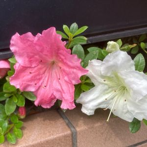 フェンスの下から、仲良く顔をだしてる😍 何が、見えるの⁉️😊 つつじでなくて、さつきじゃないかと教えていただきました。😁