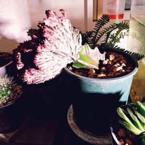 寒さにやられた #マハラジャ 顔色がよくなってきたよ?😳💕 あれ以来、夜は室内昼間は外で管理してるんだけど…… 下の土台サボ🌵の棘は茶色くなっちゃってるんだけど……上の扇のピンク色が復活してる😭💕 春を迎えられるんちゃう!?😭💕💕💕💕💕