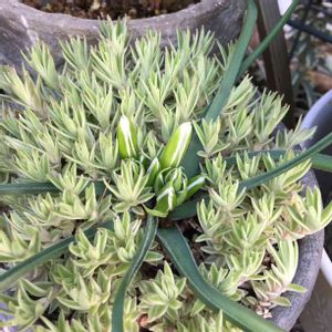 フクリンマンネングサと、オーニソガラム・フィンバリアータムの寄せ植え。去年植えたもので、フィンバリアータムはポットのまま転がりながらも咲いてて…ごめんよー!と言いながら植え直したのでした。 もう根がいっぱいになってるので植え替えたいところなのだけど、これが咲き終わってからにしようかな?