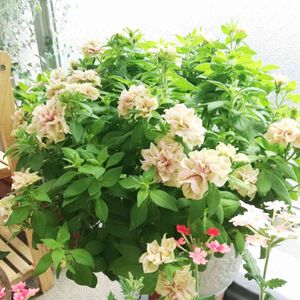 🍃ꕤ寄せ植えꕤ🍃 ゲブラさんのペチュニア「てまり珊瑚」 八重咲きでピンクに淡いグリーンがのって、クシュクシュした花びらで和の雰囲気も感じます♬ 昨年、花友さんの投稿で一目惚れ💓 手にしてこの可愛いさにキュンキュンしています💘 撮影後ピンチ✂️しましたが、上手く出来たかなぁ〜💦 ・ペチュニアてまり珊瑚(2株) ・ヒューケラフレッシュグリーン(1/2株) ・ジャスミンミルキーウェイ(1株)