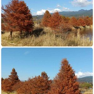 ガマを見に行った場所に綺麗に紅葉した木がありました。 近くに寄れなかったのですが、メタセコイアでしょうか? 上の写真の真ん中の雲のところ、富士山が隠れてます。 わかりますか?