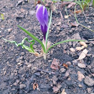 まだほんの少し残雪が残る中、雪囲いの撤去と、大量の落ち葉拾いの作業中… 来ました、今年一番乗りの蕾を発見🌸多分、コレはクロッカスですね〜(*´∀`*)
