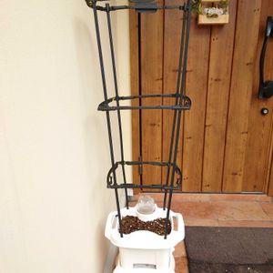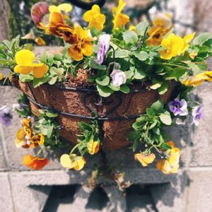 よっしゃ、割れ鉢を使った寄せ植えが完成🎉 2年ぶりの挑戦の今回は、100均のアイアン柵と麻布を使って側面にもお花を植えるスリットバスケット風アレンジに。…割れた箇所が見えない位、モリモリになって欲しいです☺️