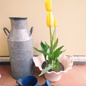 何色か分からなくなったまま鉢ごと地面に埋めてたチューリップが、ついに開花🌷 偶然ですが、全部黄色…ビタミンカラーですね☺️
