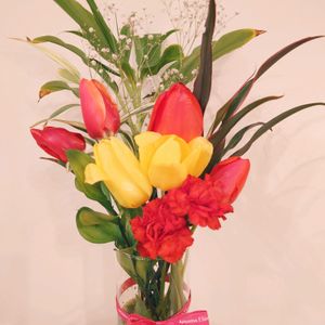 母の日で小5の娘が買ってきた2輪のカーネーション💐 …元々、今年はお庭でそんなトコから生えても困るよ…って勝手に増えたチューリップを積極的に切り花にしてたんですが…全部合わせたら、花束みたいな中々のボリュームになりました🌷