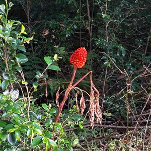 今日は爽やかな秋晴れになるかな? こんな不揃いな実は初めて。 マムシグサ、サトイモ科 花・実・葉・根(芋?)全て猛毒。 何でも食べる🦌もこれは食べられない。 高さ1mくらい。下から見るとそびえ立っている。