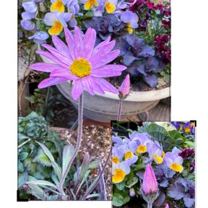ローレンセラ オーストラリアンデージー 5枚目は、後ろから🤳 今年の春は、ピンクの花が気になる🙄💞🌸💓 まだ寄せ植えしてないので、ポット寄せをしてみました。 真ん中には、まだ蕾だけど、ピンクの花が咲く🌸オステオスペルマムのサニーガリナを置いてみた。 🏷️木曜日は桃色