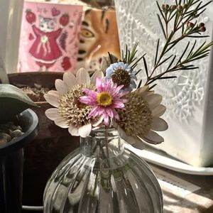 朝 庭に咲いているお花を摘んで花瓶に飾る楽しみ🥰🌷🌼 この前 ガーデンはなぞのさんからお迎えしたもの オステオスペルマム・ボンドガールキングフィッシャーデイジー カタナンケ ローレンセラ クレマチス ビエネッタ