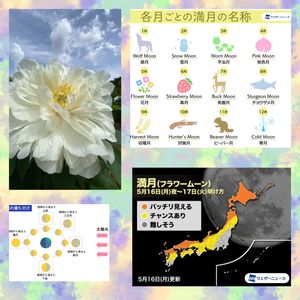 令和4年5月16日(月) 満月🌕 フラワームーン Flower Moon💐🌕 おはようございます💐🌕 今夜は満月「フラワームーン」💐🌕 北海道や日本海側ほどお月見チャンス✨ 2022年5月は、今日16日(月)13時14分頃に満月の瞬間を迎えます。アメリカの農事暦では「フラワームーン」とも呼ばれます。 今夜は北海道や日本海側ほど晴れて、まるいお月さまを楽しむことができそうです。 今夜の天気は? 今日16日(月)夜から明日17日(火)明け方は、本州の南海上に前線が停滞します。 東日本と西日本では、太平洋側ほど前線の影響を受けて、雲が広がりやすくなる予想です。ただ、一時的にでも雲に切れ間がある時間帯もあり、雲の隙間や薄雲越しに満月を見られる可能性はあります。関東や東北南部の太平洋側は雲が厚く、満月を見るのは難しそうです。 一方、前線から離れた北海道や東北北部、北陸西部や西日本の日本海側は晴れて、満月が見られます。 5月の満月、アメリカでは”Flower Moon”💐🌕 アメリカの先住民は季節を把握するために、各月に見られる満月に名前を、動物や植物、季節のイベントなど実に様々につけていました。 The Old Farmer's Almanacによると、アメリカでは多くの花が咲くことにちなんで、5月の満月を「フラワームーン(Flower Moon/花月)」と呼ぶことがあるそうです。 現象おさらい 満月とは🌕? 月は自ら光っているわけではなく、太陽の光を反射することで輝いて見えています。 そして、太陽の光が当たっている月面の半球が地球から見てどちらを向いているかによって、三日月や上弦、満月、下弦など、見かけ上の形が変わります。 地球から見た太陽の方向を基準に、太陽の方向と月の方向の黄経差が0度の瞬間が朔(新月)、90度の瞬間が上弦(半月)、180度の瞬間が望(満月)、270度の瞬間が下弦(半月)と定義されていて、およそ1か月弱で1周します。 つまり満月は、地球から見て太陽と月が正反対の方向にならぶ瞬間(太陽、地球、月の順に、ほぼ一直線にならぶ瞬間)を指します。 参考資料など The Old Farmers' Almanac 国立天文台「ほしぞら情報」 国立天文台「暦計算室」 ⚠️ウェザーニュースのコピペです⚠️