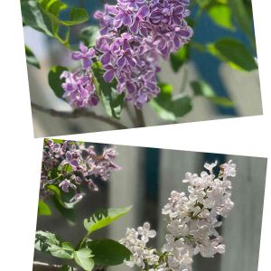 💚ライラック💜 木の全体がこうやく病にかかり弱ってしまいましたが、友人が削り取ったり薬を付けたりして看病😓 無事にお花が咲きました。 一枝だけ、白いお花になってます。 やっと咲いけど色づく力が出せなかったのかな〜😢💦
