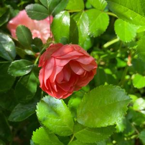 ちょっと昭和のかおりのする色 トゲがないのか?めちゃ少なくて 優しいかんじのポリアンサローズです🙂 カップ咲き好きだなあ💕