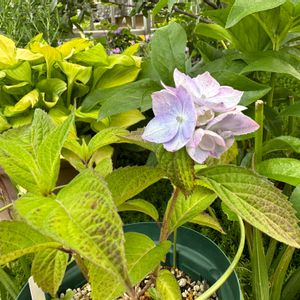 ヤマアジサイの丸山ボタンさん。 ちょっと日差しを当て過ぎたのか葉が焼けちゃいました。って事でロシアンオリーブの木陰に鉢ごと避難です。