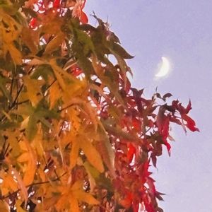 11/26 夕空に三日月🌙16時48分 今日の日の入りは、16時30分 マンションの植込みの木々も紅葉🍁 見上げると三日月🌙(輝面率31%) ①モミジバフウ🍁と三日月🌙 ②モミジもだいぶ紅く染まって ③モミジのフレームの三日月🌙 ④16時23分我が家のベランダからミニトマトと三日月🌙