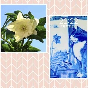 2022年2月22日22時22分にスクショしたスマホの壁紙は、クリスマスローズを見つめるニャンコ🐾💙 星のごとく咲いた我が家のクリスマスローズを添えて🌟