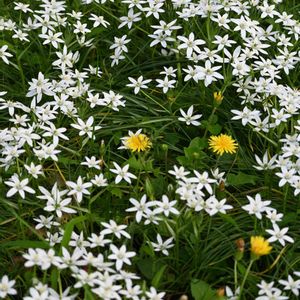 夜空に🌌天の川を咲かすなら、この花が最適✨ 今日のお花《スター・オブ・ベツレヘム》 所々でタンポポが星座を描きます🌼 🌼 学名:オーニソガラム・ウンベラータム🤍🌿 和名:《大甘菜》 🌼