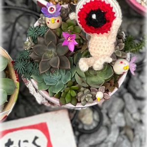 1〜3枚目 🏷️オヤジ祭り2025 1枚目 みたりん産オヤジ鉢2種とオヤジピック2種😍💕 けいこさんの編み編みオヤジにハッピ着せてみたよ〜🤣🎶💕 ミャクミャクオヤジキュピちゃんも🤣💕 ドールボディで猫娘作ってみたけど、下手っぴ〜🤣💦 2枚目 こちらもみたりん産!アヒルに乗ったオヤジ鉢💕 一緒にコラボ💞ヽ(^。^)ノ🎶 みたりんさんの鬼太郎&オヤジBoard「ゲ」最高!!🤣👍️💕 3枚目 KOHさんのオヤジおぼうぼピータン鉢と月の雫さんのオヤジおぼうぼピータン、ピータンおぼうぼオヤジ、お花オヤジピータン(名前ど忘れ🙏)🎶 マイメロちゃんの鬼太郎キュピちゃん💕 4枚目 🏷️にぃさんの日 息子に買ってもらった斑入りウチワサボテン、結構大きいんです!デカチキンよりも背が高い🤣🤣🎶 5枚目 アップで 「ギャー‼️」🤣🤣🤣🎶