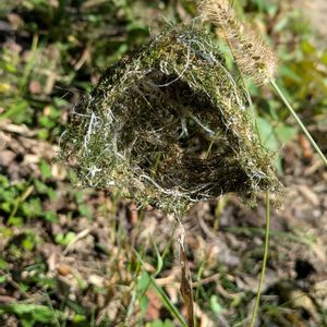少し前の 自然かんさつ会で出会いました。 植物ではありませんが、珍しいのでup します。「メジロの巣」です。 木の上から落ちて下の草に引っ掛かっています。色が緑色で見にくいですが、繊維状の植物と細いビニールらしきものが分かります。 本来は羽毛等で中が覆われているとの事。 同行の講師の先生に教えて頂きました🤗