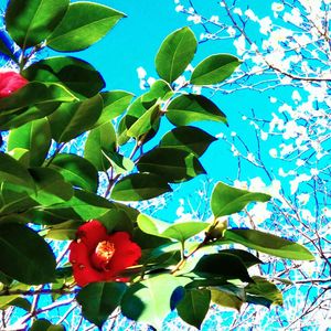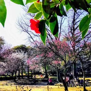 尼崎市上坂部西公園 赤い椿と白い梅の花 青空と緑の葉のコントラストがすてきです。
