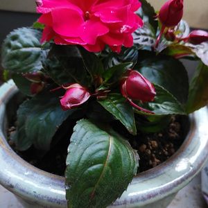 こんにちは✋😊☁ ニューギニアインパチェンス・ ワイルドロマンスのピンク💗サン たった1輪のお花に魅了され、昨日お迎えしました✌️😍 👩「沢山咲きますように🙏」