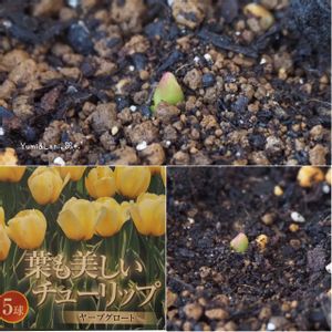 こんばんは♡•ᴗ•ꕤ*.゚ チューリップさんꔛꕤ 昨年の11月14日に植えやっと 小さな小さな芽が🌱 2つ出てきました👀 咲くと左下↙️の 黄色のチューリップさん🌷 実は初めての栽培です🔰 開花迄まだまだ先ですが… 咲いてくれますように ( ˃̶͈◡ ˂̶͈ )ワクワク〜♡ 因みにまだ芽🌱は 出ていませんが 後2種類他の鉢に 植えています🪴