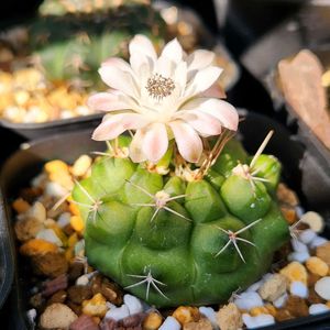 こんにちは😊 以前、ホムセンにて購入した三兄弟の中の1つ。 お名前が不明な🌵さん、お花が咲きましたぁー😊 あら👀? 初めてみるお花かも😅 中が黒いの🙄??? この子は誰ですかぁー😅😅😅? わかる方居ますかぁー? 麗蛇丸??かな🤔?