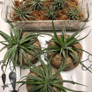 根っこ生えたチランジアを水苔と麻糸の玉に 植えました😆 水苔を丸くしてみたりしたのですが手先が器用過ぎて😏上手くいかず😆結局麻糸の玉に植えてみました😁どうなることやら🤣