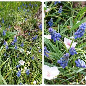 ①🌸散り桜シリーズ 🌸&🍇 桜の根元でムスカリが群生していました✨桜って散っても尚春の花との共演でまた素敵に魅せてくれるんですよね~😆👏✨ 🤔?ふと思ったのですがこの桜の木古株だからでしょうか…花弁ではなく花ごとクルクル散ってましたなぜなんでしょう🌸~~