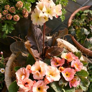 プリムラジェシカとバロータの寄せ植え どちらも塊感が強く、組み合わせに苦労しました…