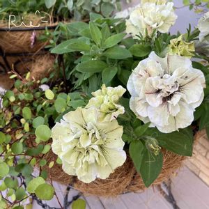 夏仕様の寄せ植え④ 淡いピンクのペチュニアに💘ハートを持って行かれました( ⁰̷̴͈ ꇴ ⁰̷̴͈ )💓 ハンギングバスケットに、ナチュラルな優しさを詰め込んだ様な寄せ植えにしたくて,,, (2021,6,5 植込み)