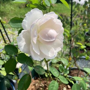 我が家唯一の白薔薇 10年くらいなるかな? 毎年松の木のしたでひっそり 咲きます 名も分からない白薔薇 皆さんのpic見てたら ジャクリーヌデュプレという名前の薔薇 に似てるかな? 初めて投稿します 今年、挿し木で4株増やし 来春地植えして家族を作って やる予定😋👍