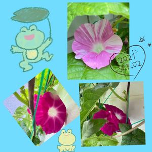 今朝の朝顔 大輪でなく可愛い朝顔が 咲いてます 花びらに切れ目が入っているのと 左上のフリフリちゃんの 変化朝顔可愛いですね💕 フライングソーサーとキキョウ咲き 毎日咲いてくれてます😊 今日も元気出していきましょう♥️