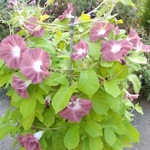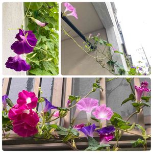 今朝の朝顔♥️ 今日も暁の舞やフライングソーサーは 元気元気でたくさん咲いていますが 他の暁シリーズが3種類咲いていたので😊 左上から時計まわりで 暁の紫、暁の露、暁の春 そして団十郎さん ちょっと雨に濡れましたがなんとか 咲いてくれました♥️ 今日も元気で 楽しい一日をお過ごしくださいね♥️