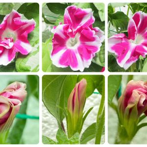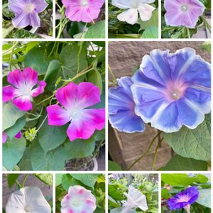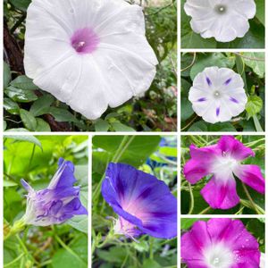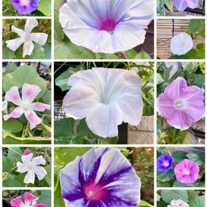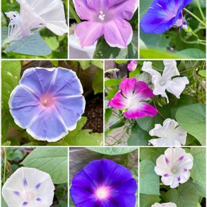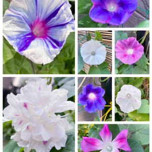 今朝の朝顔 真ん中が初開花 巨大輪 曙 その上下が今朝の曙の虹🌈 左側は変化朝顔 色違いがたくさん咲いてます 右側はツルなし朝顔、ミルキーウェイ、雪 段々花数が増えてきました♥️ 今日も素敵な一日になりますように♥️