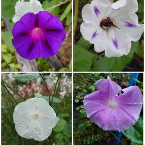 やっとアサガオの投稿ができました ゆっくりと花を眺めてる暇も無かったので今朝見たらいくつか咲いていました 西洋アサガオと右下は去年のこぼれ種の大輪が咲いてましたが残念ながら破れてしまっています 朝からミツバチも頭から突っ込んで頑張ってますね🤣
