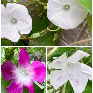 おはようございます よく降りますね☔️ 被害が大きくならないこと 祈ります🙏 今日の朝顔♥️ 💜上は一つの花を前と横から 丸葉ヒゲ咲き 💜左下は富士の紫 💗右下はクリムソンランデブー 雨でも頑張ってます💓 今日も良い一日をお過ごしくださいね♥️