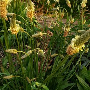 ①オオバコの仲間が生えています ②下から順に咲きます ③雄しべが見えます ④広い場所ではまだ花穂は寝ています 茎の先だけ花が付くのでヘラオオバコと思います ps 4/23花の部分が伸びてきました。ツボミオオバコなの❓ ⑤小雨の中のナミアゲハ