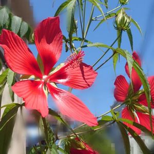 8/3㈫④ 🏷真っ赤な火曜日 🏷赤い花も素敵♪ 🏷青空とコラボシリーズ モミジアオイが青空に映えて綺麗に咲いていました。 住宅はぼかしアプリでぼかしました😄