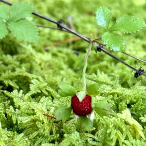ふかふかした絨毯みたいな苔の上で心地良さそうなヘビイチゴ🍓 苔はヒノキ苔かな?