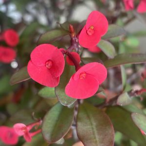 今日のお花 ハナキリン 我が家のはみんな8年目のハナキリンです。 寒くなったので、花が咲いててもみんな室内に入れました。 I枚目 トゲナシハナキリン レッドドラゴン。 名前は勇ましいが、黒軸で紅い小さな花と葉っぱが可愛いレッドドラゴン😍 2枚目 大輪トゲナシハナキリン シャインキッス。 花の大きさは3センチ位になるんですが、今は2.5センチ位です。 3枚目 ハナキリン 八福神です。 クリーム色のはながさきますが、植え替えせずにいるので、茎は細くなってます。 冬は水やりほとんどしなくてもいいのに、他の観葉植物と一緒にやりすぎて、ピンクの八福神はダメにしてしまいました🥲 こちらだけ残ってますが、昨日室内に入れたばかりで、葉が紅葉しちゃってます。 ハナキリンは、耐寒性ないので、早めに室内に入れないといけないですね。 4枚目 姫ハナキリンです。 今は、花が一つも咲いてません。 小さな赤い可愛い花が咲きます。