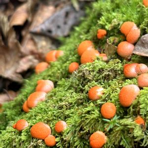オレンジ色の小粒が群生している若いマメホコリ キノコではなく粘菌(変形菌)らしい 自然はおもしろいね🙃