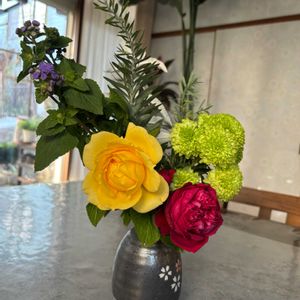 友遠方より来る🥰 また楽しからずや(*ˊ˘ˋ*)。♪:*° お庭で咲いてる花々❁⃘*.゚を入れた素敵なミニブーケいただきました。 黄色い薔薇は、ゴールドバニー 色鮮やかな黄色ですね💛 赤薔薇は、ルージュロワイヤル 花びらたくさんのコロンコロンとした花が重そうです。 紫の花は、アゲラタムかな? シルバーリーフは、ブッドレアシルバーアニバーサリー もう一つのリーフは、ミモザかなって思ったら、アカシアブルーブッシュだそうです。素敵な葉だね😍 ライムグリーンの菊は名前不明だそうですが、Googleレンズだと可愛いポンポンマムかな…🤔💭 手作りのポポラスミルフィーユも可愛い🌸*¨* ஐ•.¸¸💖✨ 壁に飾ったら素敵love ✨💖 *¨* ஐ•.¸¸🌸 メープルラウンドパンも美味しくいただきました🥹 パンプキンスープによくあいます。 また遊びに来てね(*´∀`)ノ