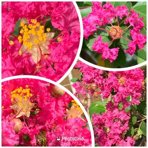 百日紅(サルスベリ) 昨日の“今日のお花“でした。写真を撮ってUPしようとしてて、忘れてました😅 『サルスベリの花の構造は面白く、フリルの付いた団扇のような花びらが6(7)枚、内側に花糸が短くて葯の黄色い雄しべが多数、外側に紫色を帯びた葯を持ち花糸の長い雄しべが6(7)本あって内側に曲がっています。 そして柱頭が曲がった雌しべが1本あります。』 と、説明がありました。 その他にも、 『雄しべは約40本あり、外側の6本は葯が紫色で長く、それ以外は葯が黄色くて短く、しかもそれぞれの雄しべでつくられる花粉は機能的にも形態的に も異なっています。受精するのは長い雄しべの花粉で、短い雄しべの花粉は花粉を運んでくれるハチの餌さになります』 中央の黄色い蕊には、6枚の白いガクがありました。それが花のようにも見えるのですが、実際の花びらは、外側にフリフリのフリルのようにのが花びらです。 雌蕊は、雄蕊の中にあるようですが、写真ではわかりにくいですね。 花は一日花となってましたが、散らずについてるので、長く咲いてるように見えます。