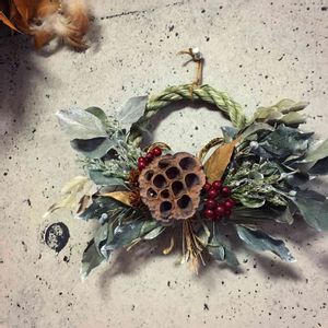 しめなわ飾り 作りました♪ 今回は ドライフラワー で❤️ お家にあるドライと、 百均 の ドライリーフ や 木の実 を使いましたー☆ 大好きなグレビリアの葉を入れようかと悩んだけど、百均のゴールドにペイントされたリーフが同じ感じだったので、そちらで代用しました〜。 赤い実は サンキライ ❤️ 今年は余裕もって仕上げられて良かった! あとは年賀状だっ!!