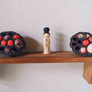 とっ子ちゃんが 庭の蓮の実で作った飾り物と 仏様 仏様は5㎝くらい ここはとっ子ちゃん家