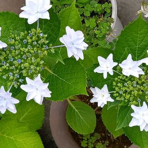 おはようございます☀️ お日様が元気、その代わり9℃と肌寒い朝です✴️✨ 鉢植えにお水をあげていると…あれ?母の日に娘からプレゼント🎁でもらった紫陽花って葉っぱ斑入りだったかなぁ⁉️ よくよく見ればお花が咲いていました😲 3度目の開花です💕 もう涼しくなって来ているのでお花が群生ではなく1輪づつ😊 でもうれちい💝🙌💝 まだ幾輪か蕾があるので楽しめそうです✌️