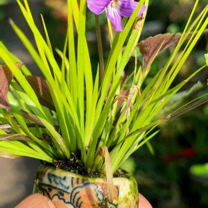 昨日、盆栽皿の中に紫色が、、、 豆盆栽の石菖の中に 溢れだねが、入ったのでしょうか? 高さ4cm位の雑草の姫スミレです🤗