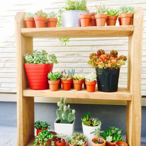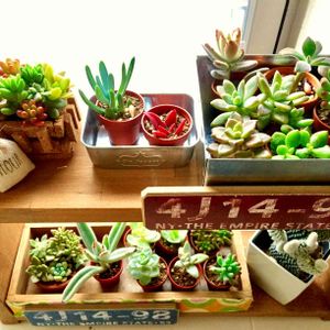 【義父遺作の好評多肉棚Part3】 少しづつ遊ばせてもらってます。 セリアに行って小物を買い足し プレートを貼ってみました😊 木箱を買って布を貼りました😊 缶にも詰めて まだまだ遊べそうです\(//∇//)\