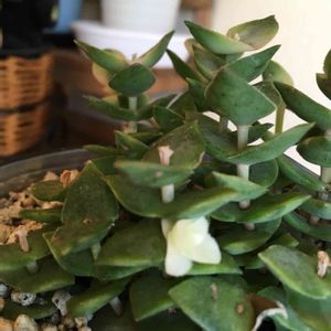 玄関に置いてますが葉も変色してきたのでダメかなぁって思ってたら今朝白い小さな可愛い花をつけてました😍